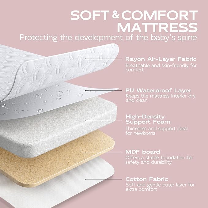 - Many Convenient Designs: Bassinet installed in minutes without tools, full set of removable to machine wash, four movable wheels, large capacity storage rack