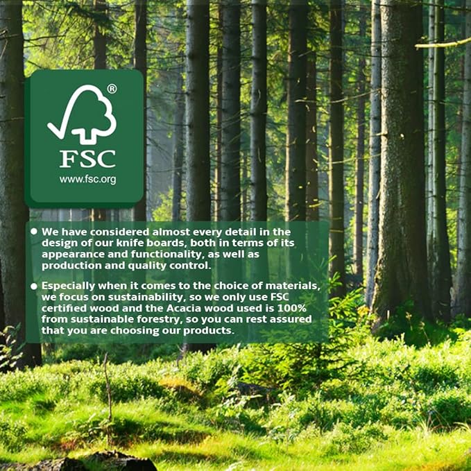 - PREMIUM ACACIA WOOD: we only use FSC certified wood for our production of knife block. The Acacia wood used is 100% sourced from sustainable forestry. Not only does it make your kitchen noble and elegant, but it also protects knife utensils very well.
