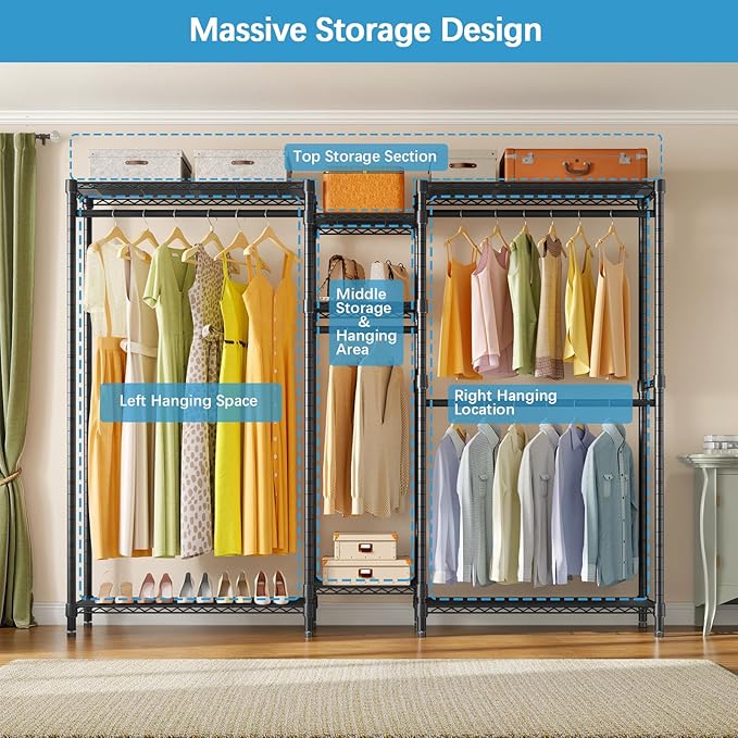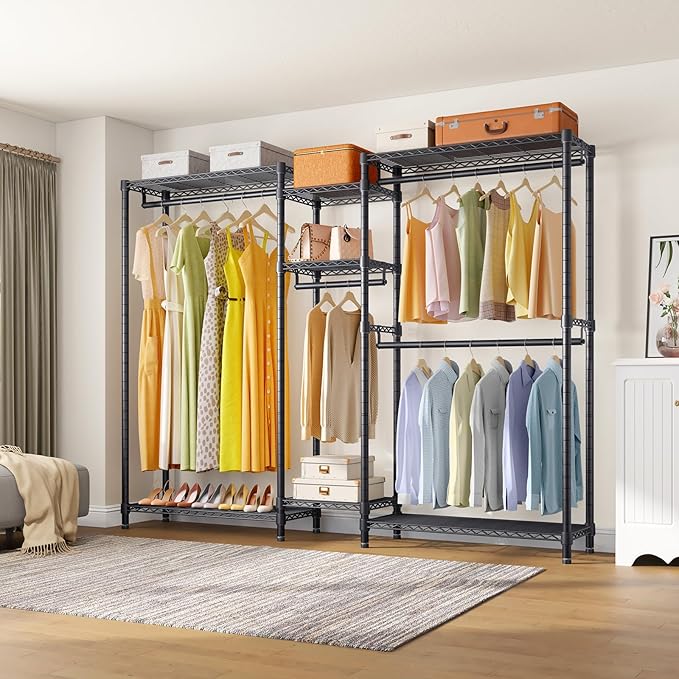 - Multifunction Clothes Rack: Including 7 adjustable shelves and 4 detachable hanging rods for hanging suits, coats, long dresses, jackets, pants, shirts or other heavy clothes. This freestanding closet system ensures you enough space for the essentials. It's a great closet organizer for extra hanging space or seasonal storage.