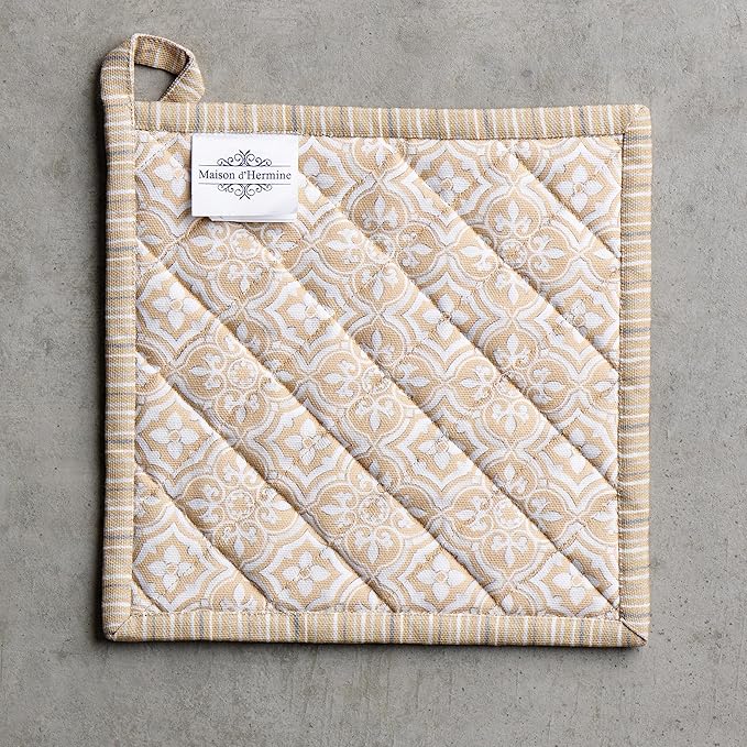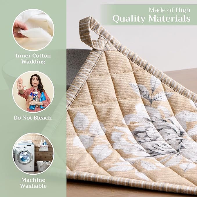 - Premium Quality: Crafted from quilted 100% cotton, this heat-resistant pot holder set protects your hands from hot cookware. Each piece features a built-in hanging loop for easy storage and quick access. Perfect for everyday home kitchens, farmhouse kitchens, hotels, restaurants, and bakeries
