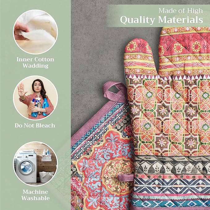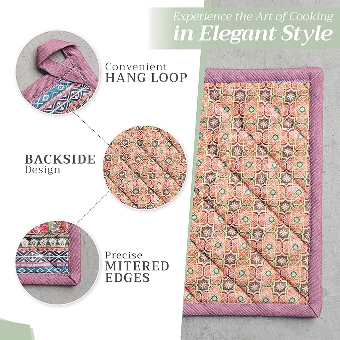 - Premium Quality: Crafted from quilted 100% cotton, this heat-resistant oven mitt and pot holder set protects your hands from hot cookware. Each piece features a built-in hanging loop for easy storage and quick access. This versatile set is perfect for everyday home kitchens, farmhouse kitchens, hotels, restaurants, and bakeries