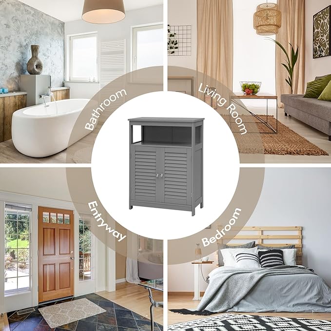 COSTWAY Bathroom Storage Cabinet, Wooden Side Storage Organizer with Louver Doors & Removable Shelf, Freestanding Floor Cabinet for Living Room, Kitchen, Entryway (Grey)