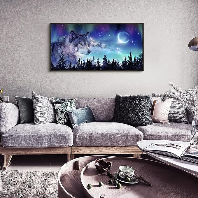 Framed Canvas Wall Art - Large Size Aurora Scenery Paintings - Abstract Wolf Wall Pictures - Black Framed 24" X 48" - For Living Room, Bedroom & Office Decor