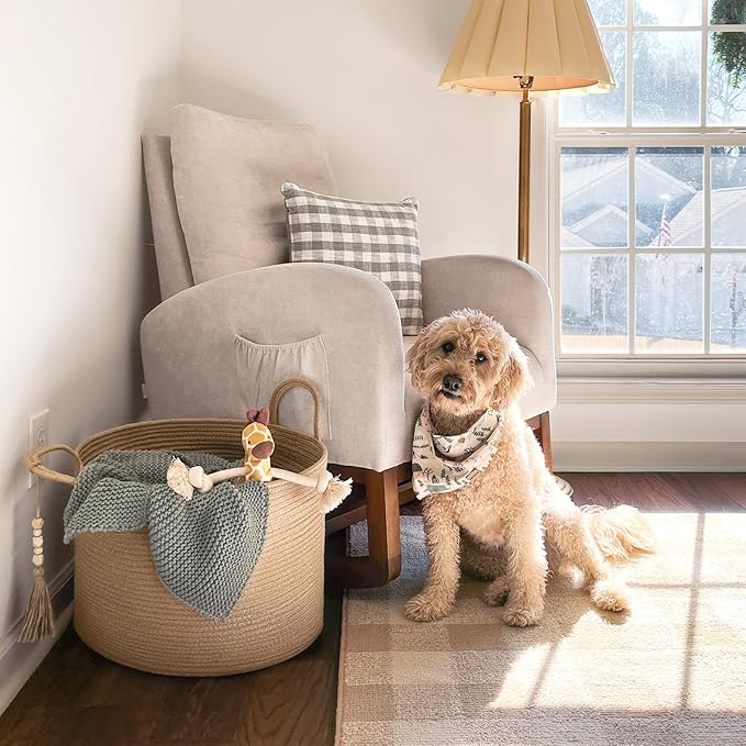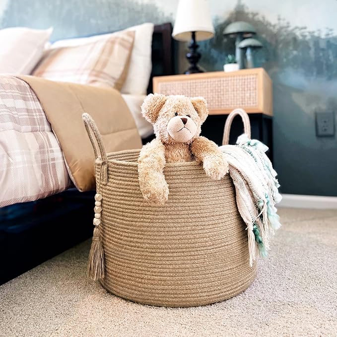 - Unique Home Decor. This large basket is designed with a wooden bead tassel, perfect as a farmhouse basket for your home. Combining functionality and style, it can organize clutter while bringing style to any space such as living room, laundry room, bedroom, bathroom and more