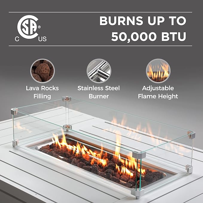- 【CSA-CERTIFIED FIRE PIT TABLE】Featuring weatherproof aluminum structure and stainless steel burner, the fire pit table is approved for use by the CSA Group and is durable enough to withstand the influence of temperature, rain, and wind. This striking 50,000 BTU propane gas fire pit serves as a focal point for your fresco evenings. Best of all? It’s easy to operate.