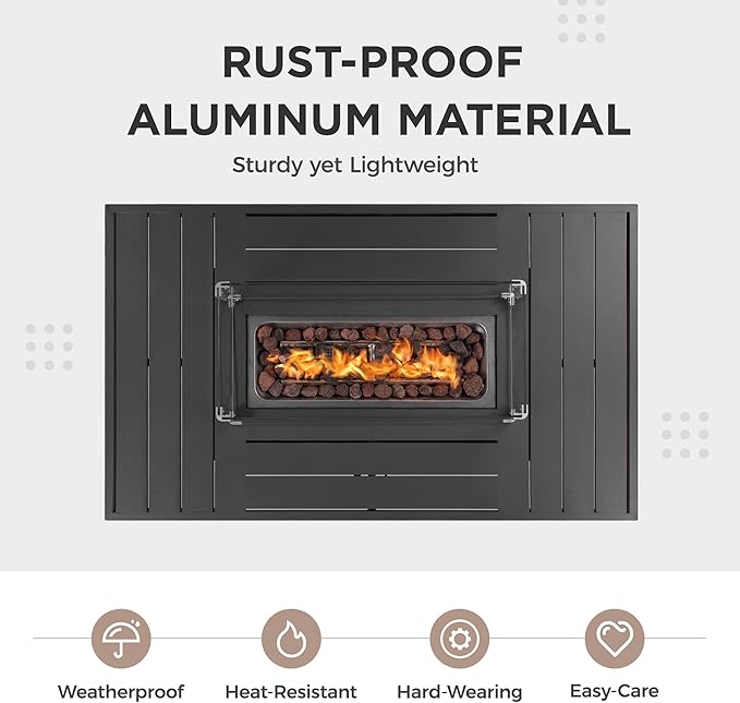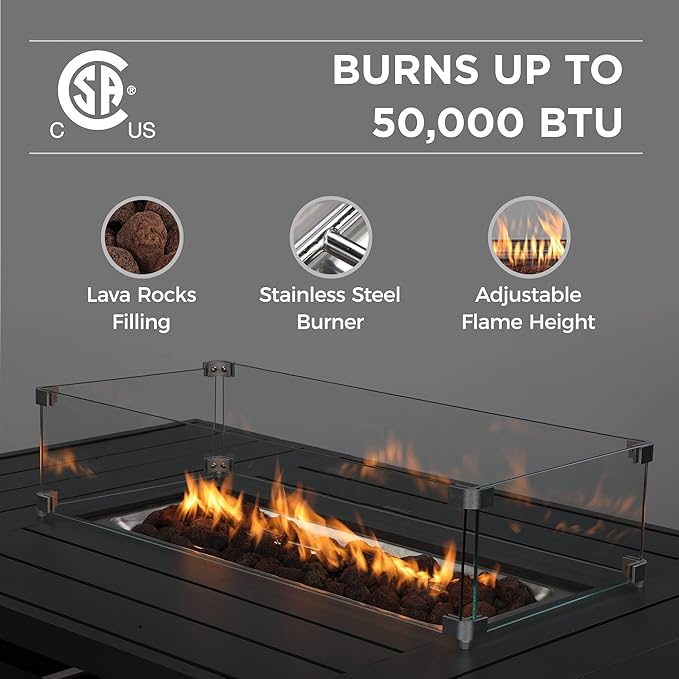 - 【CSA-CERTIFIED FIRE PIT TABLE】Featuring weatherproof aluminum structure and stainless steel burner, the fire pit table is approved for use by the CSA Group and is durable enough to withstand the influence of temperature, rain, and wind. This striking 50,000 BTU propane gas fire pit serves as a focal point for your fresco evenings. Best of all? It’s easy to operate.