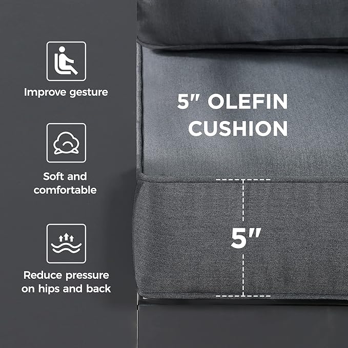 - 【5-INCH OLEFIN CUSHION】Covering the top of the outdoor furniture baseplate, the piped cushions provide 5-inch padding as you sit. Thickened at the waist, the foam-filled cushions encourage proper posture while you sit. Each cushion of the outdoor patio set is wrapped in Olefin fabric, so it's sure to stand up to UV rays beaming down when left outdoors.