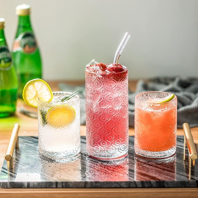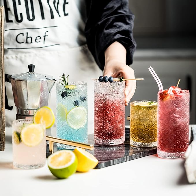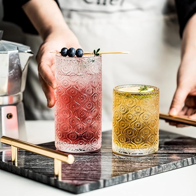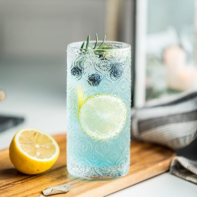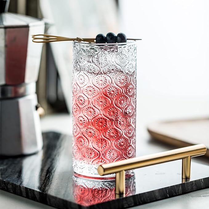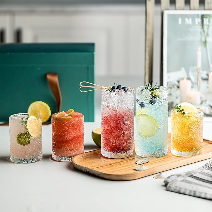 Glass Cups Vintage Glassware Set of 4, Drinking Glasses 12.5oz, Embossed Pattern Style Transparent Cocktail Glasses Set, for Ice Coffee,Juice,Beer,Bar Beverages,Drinkware, Transparent (L)