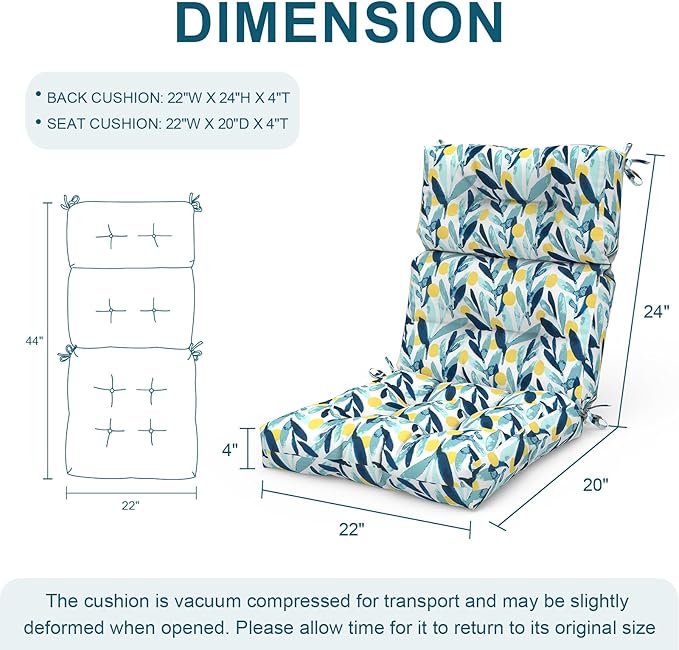 - 【PACKAGE】 - Package come with 2pcs tufted high back chair cushions with dimension seat cushion 22"W x 20"D x 4"T / back cushion 22"W x 24"H x 4"T, Please note product will arrive in a compressed state and allow a few hours to expand to final size listed in description