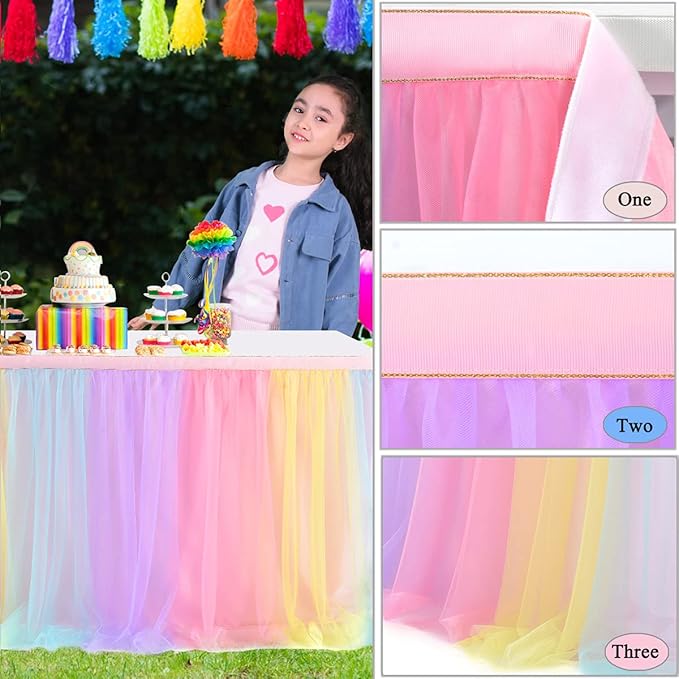 - Material: The pink anti-wrinkle lining cloth is matched with soft and comfortable yellow, blue, purple and dark pink spliced tulle, color bright and colorful.Washable, natural drooping,wrinkle resistant,durable.Can be reused.Avoid sharp items or the tulle table skirt may be damaged.