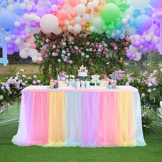 - Wide range of use: Colorful rainbow table skirt perfect for rectangle table, round table, unicorn table cloths for parties, unicorn table decorations for girls birthday, candy party, cake party, dessert party table decorations, baby shower decorations for girls, gender reveal, birthday party, baby 1st birthday party, wedding, holiday parties, etc.