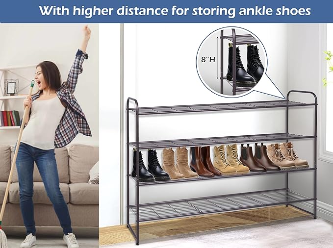 - 【Boots Fitted-Add Sparkle to Your Closet】 Adjustable height of 8", each shelf is 2.2" higher than other 4 tier shoe rack organizer, ankle boots and high heels can be displayed well and keep good shape, also can remove a row to store long boots;
