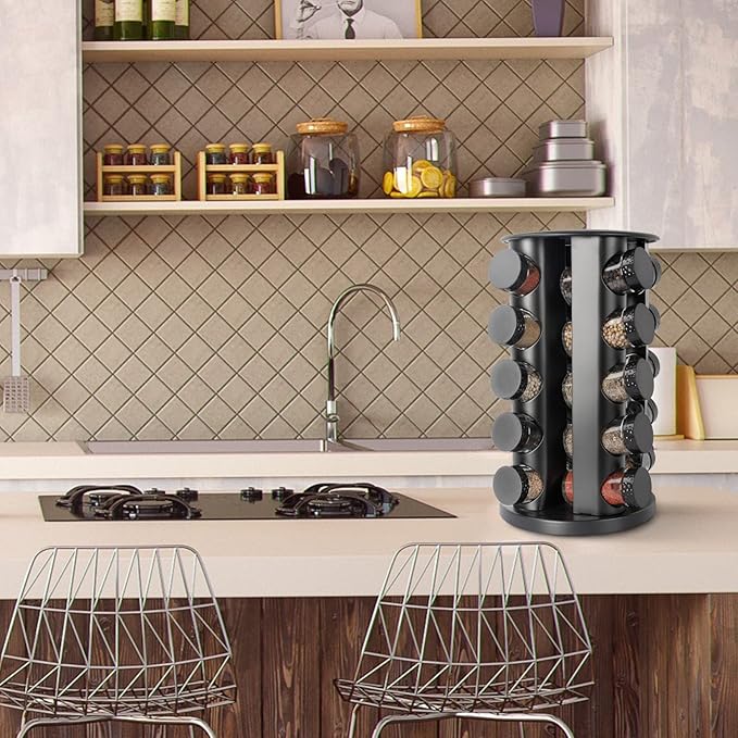 Black Countertop Rotating Spice Rack, Round Empty 20-Jars Revolving Spice Rack Organizer, 135 Spice Labels with Funnel Complete Set, for Kitchen Countertop, Cabinet