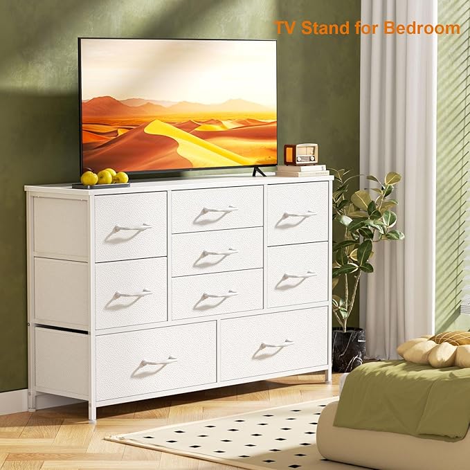 - Large Storage Space:Features 9 removable wide and deep drawers with 10.6 cubic feet storage space, The bedrooom dresser is perfect for organizing clothes, blankets, scarves, socks and other accessories. The dimension of the dresser is 13.78"D x 45.07"W x 29.52"H .Wood tabletop max weight 50 lbs, it is safe enought and wide for TV 55'' as a TV stand console.