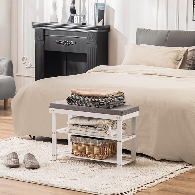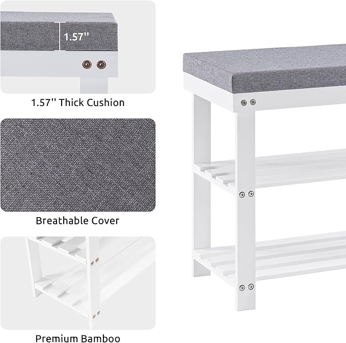Apicizon 3-Tier Shoe Rack for Entryway, Bamboo Shoe Bench with Cushion Padded Seat, Small Shoe Organizer with Storage for Indoor Entrance Hallway Bedroom Living Room, White