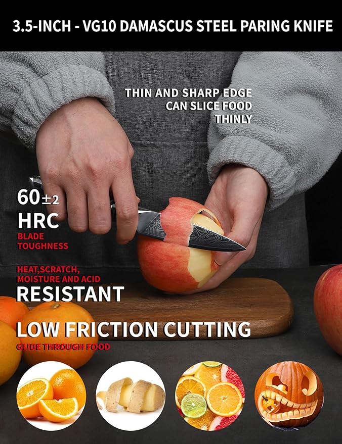 - Premium Blade: This is a paring knife type, the precise spear point blade is made of 67 layers of Damascus steel, the core layer is VG10 material, wrapped by 33 layers of high-quality high-carbon stainless steel layers on each side to ensure excellent strength, toughness and durability. The polished surface can minimize drag for jelly-smooth cuts and enhanced non-stick performance