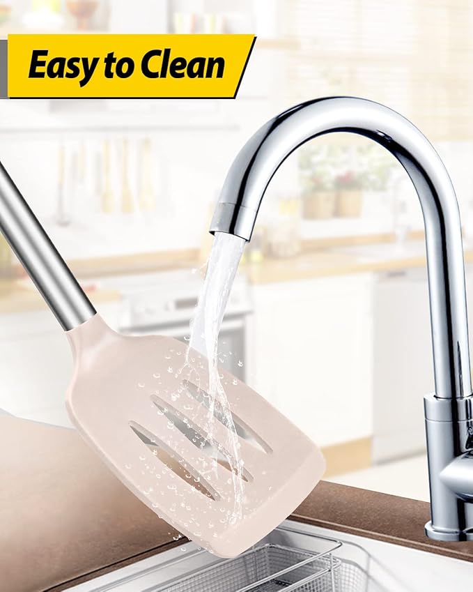 Pack of 2 Silicone Solid Turner, Non Stick Slotted Kitchen Spatulas, High Heat Resistant BPA Free Cooking Utensils, Ideal Cookware for Fish, Eggs, Pancakes(Stainless Steel Khaki)