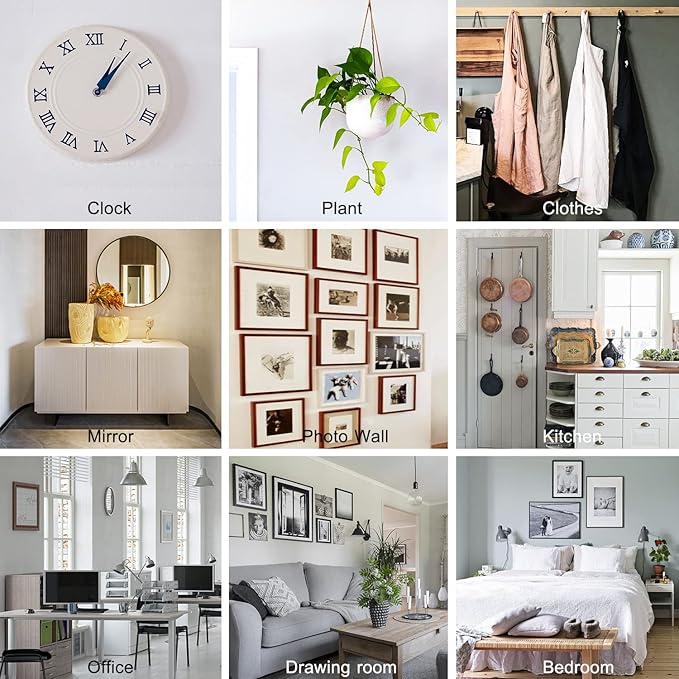 - Wide application: The picture hanging kit can hang picture frames, photos, mirrors, clocks, posters,postcards, paintings, plants.Suitable most items in your home ,office, art gallery or anywhere else you need.
