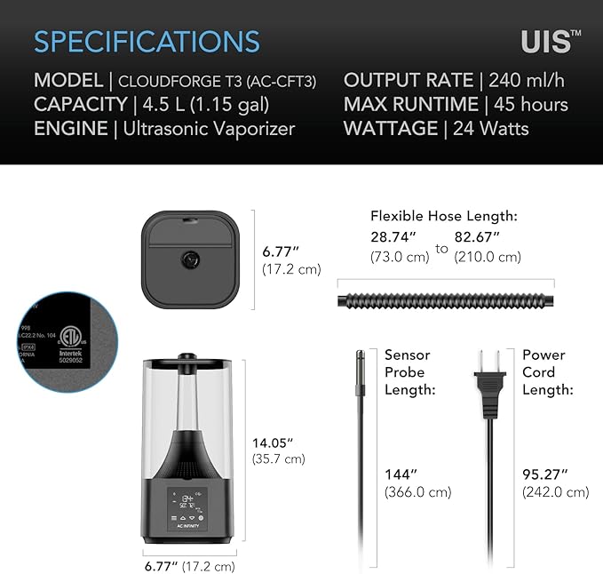 AC Infinity CLOUDFORGE T3, Plant Humidifier 4.5L with VPD Humidity Controls, 10-Level Precision Vaporizer, Extendable Targeting Hose and No-Leak Seal for Grow Tents