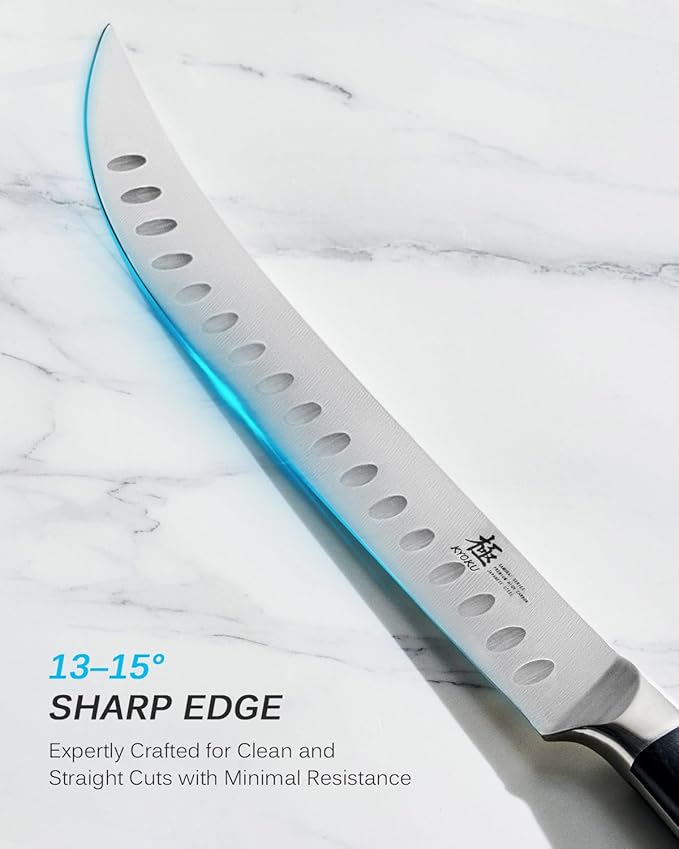 - Razor Sharp Blade: This carbon steel breaking knife's ultra-sharp blade is precisely honed to 13-15 degrees, making it perfect for slicing hams, roasts, and poultries, while the dimples prevent food from sticking