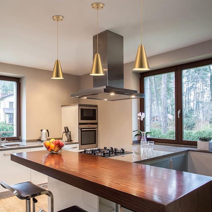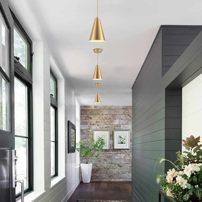 - Modern Farmhouse Style: This brushed brass finish pendant light combines modern farmhouse and industrial,stylish cone lampshade shape, breaks the visual balance of the space and creates a high-level decorative interest.