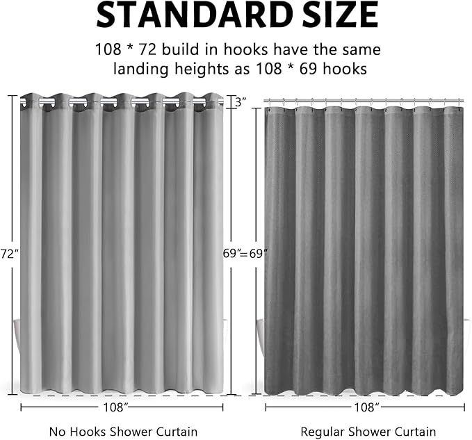 - Package & Care Instruction: Package includes 1 water resistant shower curtain (Extra Wide Size:108" W x 72" H built-in hooks HAVE THE SAME SIZE as 108" W x 69" H regular shower curtain). Machine washable. No bleach. Tumble dry low. Iron with low temperature.