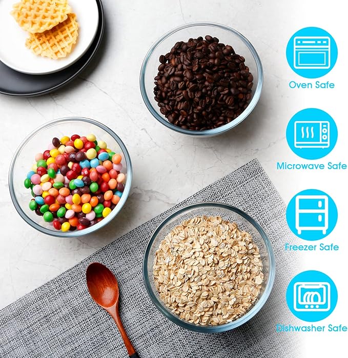 - Versatility in Kitchen: The small glass bowls are perfect for prepping, mixing, serving, storing, marinating, baking and re-heating food in the microwave. Sit nicely stacked and stable in drawer or cupboard.