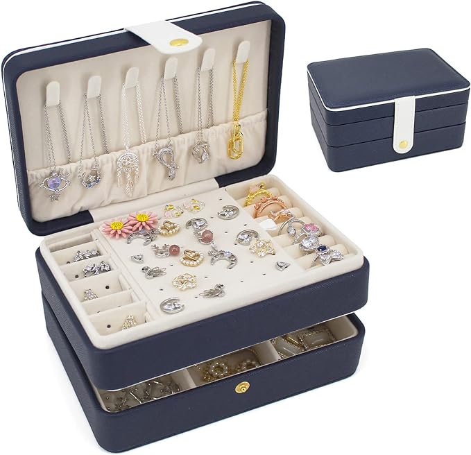 KOOAAICCHI Small Jewelry Box, Travel Jewelry Organizer, Portable Jewelry boxes for Women Girls Gift, Double Layers PU Leather Jewelry Holder for Rings, Earrings, Necklaces-Blue
