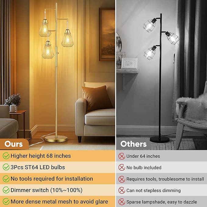 - Industrial standing lamp with full lighting: 3 LED Edison bulbs guarded in beautiful elegant black lines cages. The floor lamps with 3 lights emit a cozy soft light for a warm comfortable ambiance, adding a decorative effect to your room. 3 lampshades of varying heights and angles to ensure a wide circle of illumination brings ample light. The industrial-inspired design with a statement-making appearance makes this dimmable cage 3 bulb floor lamp an excellent choice for the living room bedroom