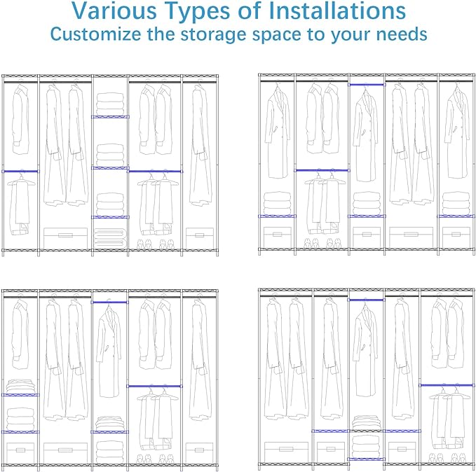 - Versatile Flexible Closet: This open wardrobe can be Installed into different ways. It has adjustable shelves and detachable hanging bars so you can customize the storage. L shape for small spaces like corner, apartment, bedroom; Straight-lined shape for walk-in closet and cloakroom clothing store.