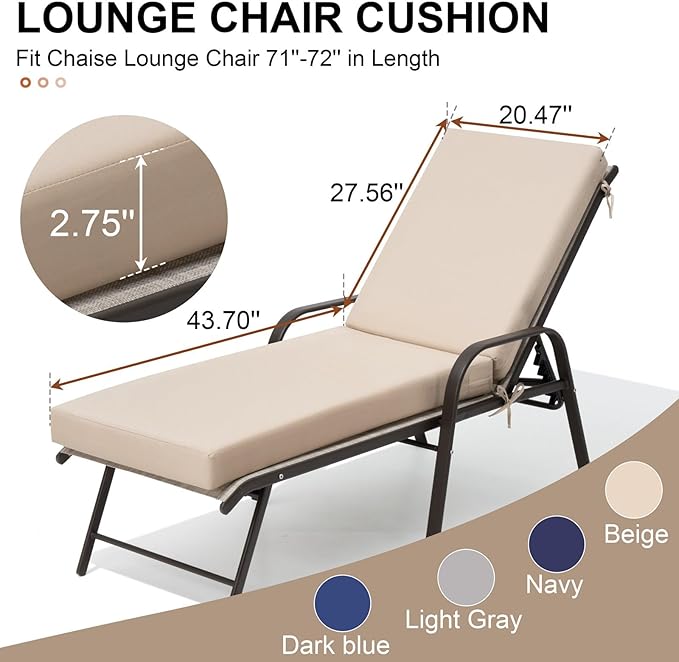 - Universal Fit: Designed to fit most 70”–72” outdoor chaise lounges, the lounge cushion is perfect for patio, poolside, beach, deck, or indoor spaces.