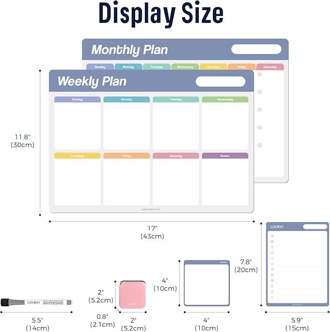 - Great Size & Iridescent Design: Dry erase monthly&weekly calendar (17" x 11.8"), checklist(5.9" x 7.8"), mini note(4"x4"), are the perfect size for your refrigerator for easy visibility and accountability. The minimalist design is great for multiple tasks and calendar reminders, while the iridescent color further decorates you.