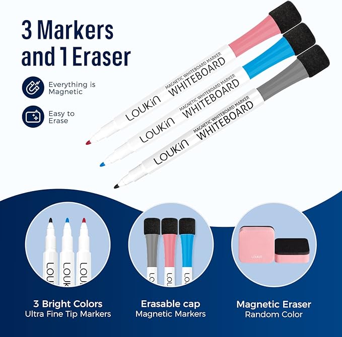 - Package Content: Includeds 3 Bright Fine Tip Markers, magnetic eraser cap for quick correcting or erasing, and a magnetic eraser for better cleanup. Easy to store on whiteboard, fridge, or other magnetic surface.
