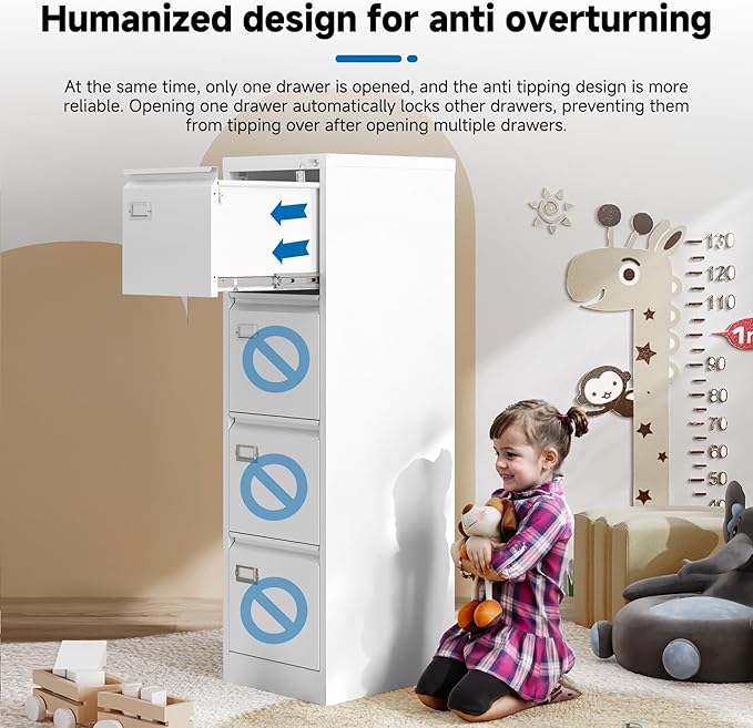 - 【HIGH SECURITY】This file cabinet can lock 4 drawers at the same time with one lock, and is equipped with 2 keys. With an anti-tilting mechanism, when 1drawer is opened, the interlocking system prevents the other drawer from opening, thereby preventing tipping and protecting your safety.