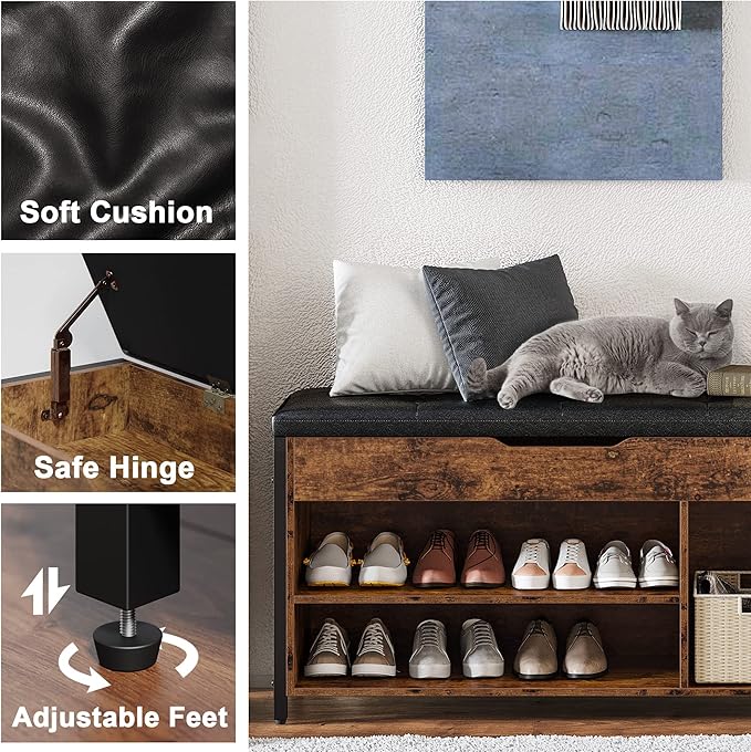 - 【Lift Top Hidden Storage】Shoe storage bench with a lift top storage design provides space for storing small items and protects your entryways from disorder The safe and strong hinges can keeping this storage up so that you don`t have to hold it with your hand ; gently open the cushion can be fixed, sturdy support points to avoid pinching hand.