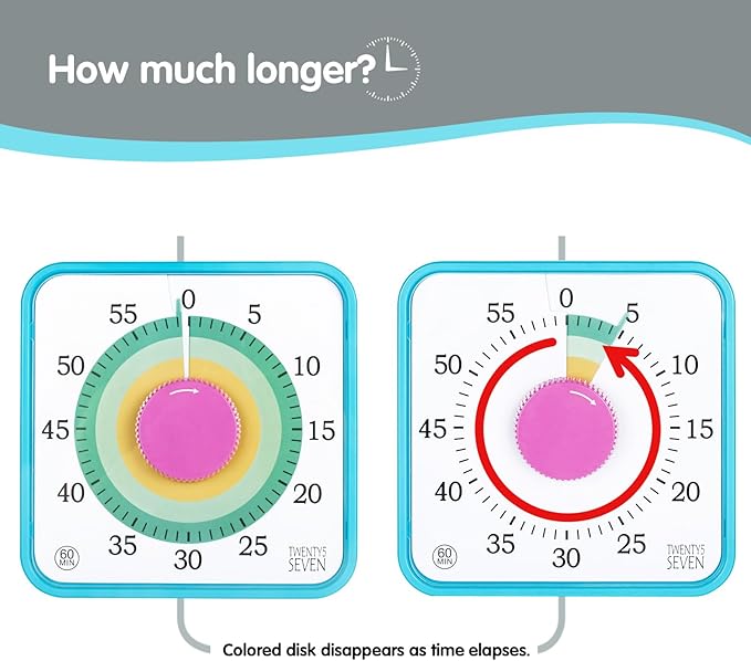 TWENTY5 SEVEN Countdown Timer 7.5 inch; 60 Minute 1 Hour Visual Timer – Classroom Teaching Tool Office Meeting, Mechanical Countdown Clock for Kids Exam Time Management Magnetic, Colorful
