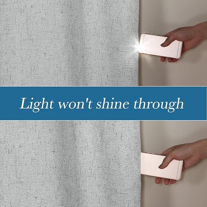 - 100% BLACKOUT: These elegant faux linen curtain is passed GLOBAL RECYCLED STANDARD certificate, has white color lining on backing, definitely can block out 100% bright sunlight and UV ray, turn day into night, just enjoy your sweet sleeping and protect your furniture from color fading, providing entire privacy in your place