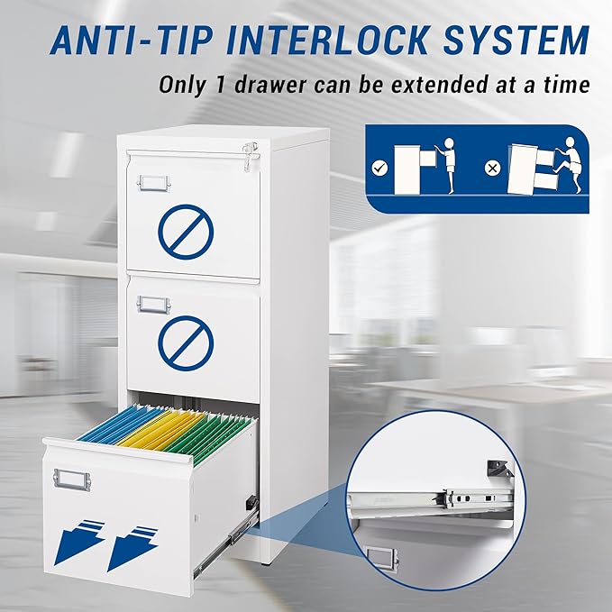3 Drawers Vertical File Cabinets - 17.8" Deep Lockable Filing Cabinet - White Metal Storage Cabinets for Home Office to Hanging Files Letter/Legal/F4/A4 Size