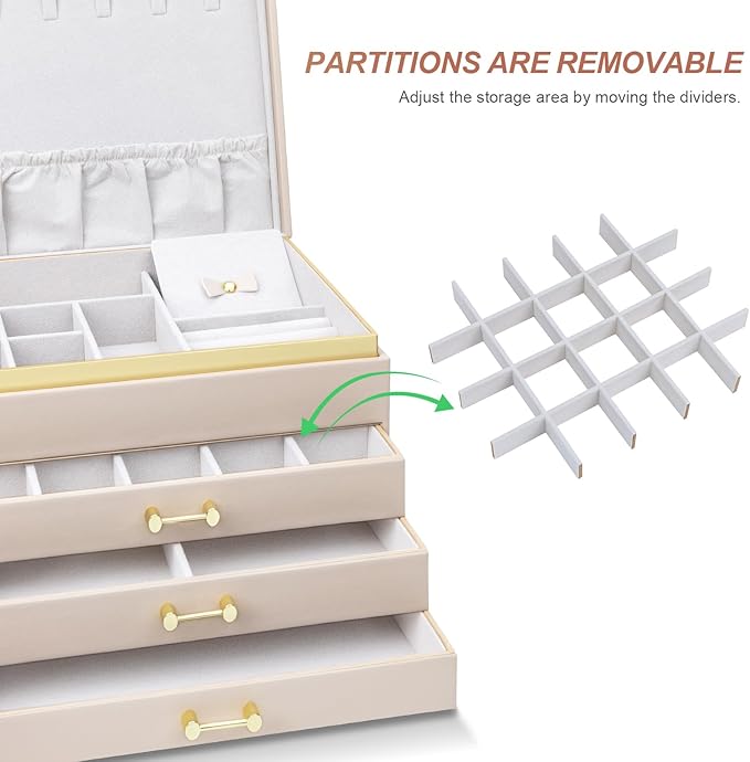 - Large capacity storage - 4-Layer Jewelry box with an additional necklace hanging area to prevent necklaces from tangling. The compartments are divided by function and can store rings, necklaces, earrings, bracelets, and watches.