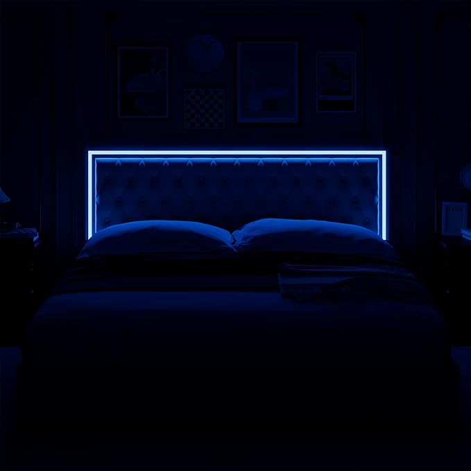 - Height Adjustable LED Headboard: Use the remote control and mobile APP to control the LED lights on the headboard, which not only meets the simple lighting needs but also creates a romantic atmosphere for the bedroom. The headboard of this upholstered bed frame has two adjustable heights. The recommended mattress height is 10-12 inches.