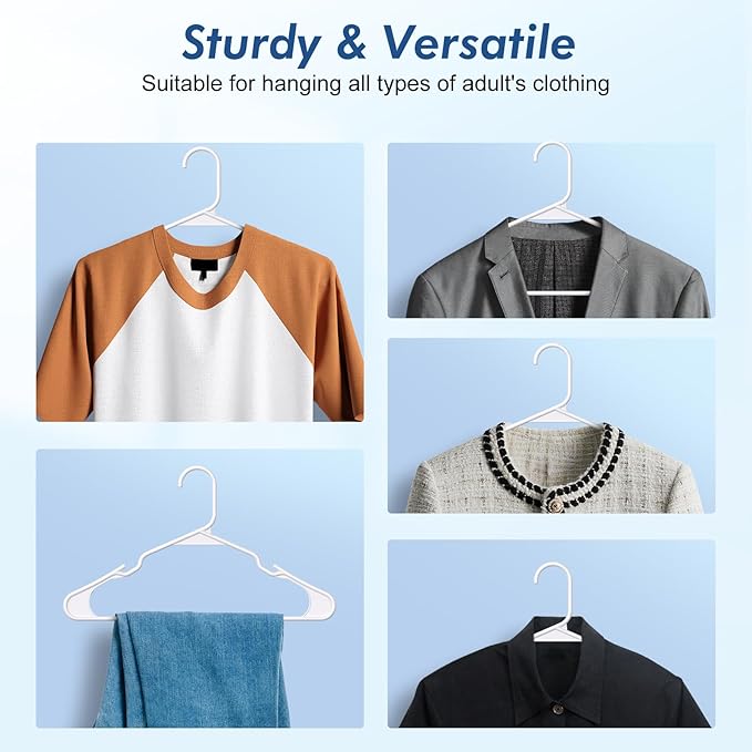 - Clothes Hangers Space Saving: Our thin hangers are sturdy and durable enough for everyday use, and their slim design saves more than 75% of closet space. The white hangers plastic make your closet more manageable, not only making it look neater but also saving you time fighting with cluttered hangers.