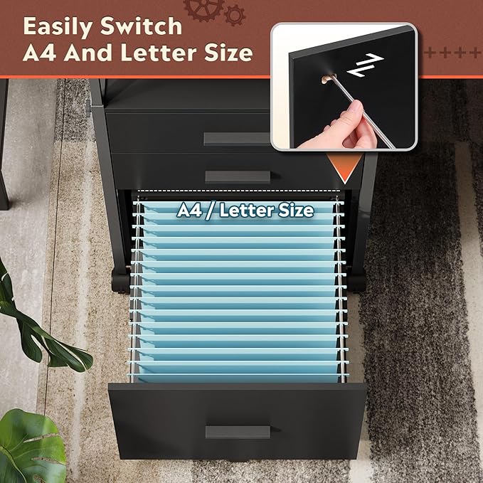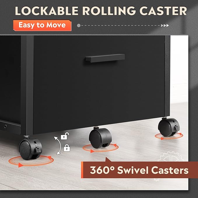 - Easy to Move: The rolling file cabinet has 5 wheels, so it can fix or move around your home office freely. Built-in brakes on front 2 casters to keep the filing cabinet in position and add stability. The bottom drawer with a caster under it that can prevent tipping.
