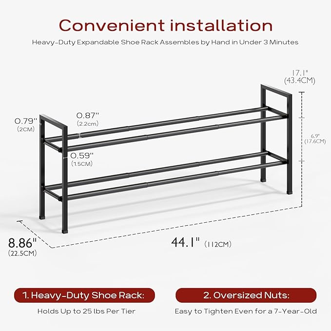 - 【Expandable Long Shoe Rack】Featuring a three-section telescopic design, this rack extends from 18 inches (45 cm) to 44 inches (112 cm), providing ample storage for up to 12 pairs of adult shoes.