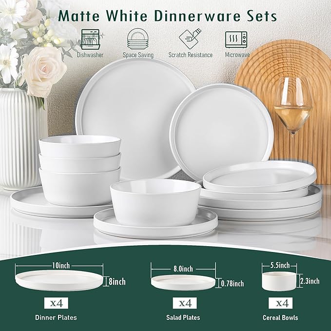 - WHAT'S IN THE BOX: This meticulously packed set includes 12 pieces, consisting of 4 10.0-inch dinner plates, 4 8.0-inch appetizer/snack/salad plates, and 4 26 oz soup/cereal bowls. We assure you that every item has undergone thorough inspection to ensure its safe arrival without any breakages. Each set is meticulously packed and inspected to ensure that they will arrive intact.