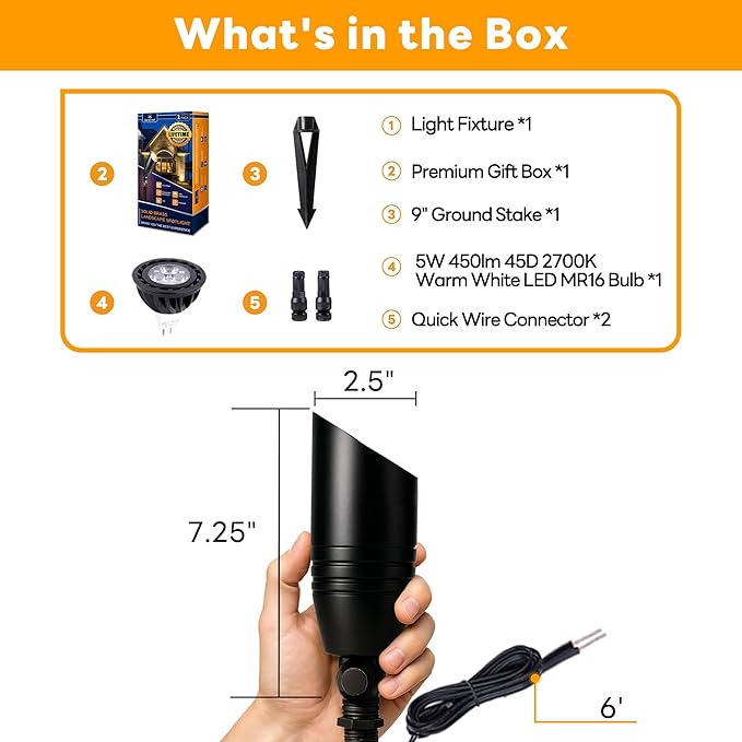 - ๐๐ซ๐ข๐ ๐ก๐ญ: Outdoor spotlight with a 5 watt LED MR16 bulb (450lm). Lights up exterior trees, walls, flags, and fountains up to 10-12 ft. 180ยฐ adjustable while the ground stake stays in place