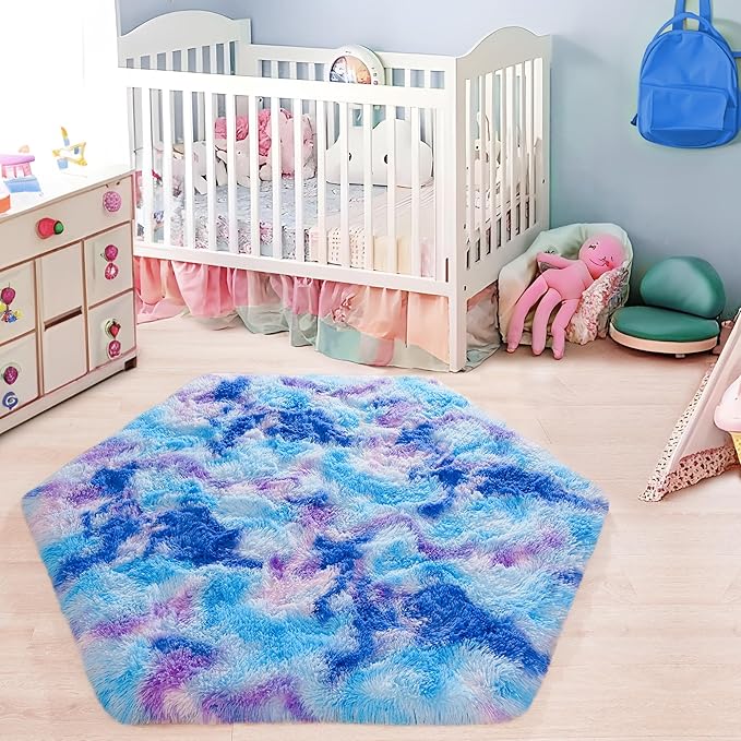 junovo Ultra Soft Hexagon Rug Fluffy Rainbow Nursery Rug for Princess Tent Kids Play Castle, Furry Hexagonal Carpet for Kids Girls Room Playhouse Classroom Dorm Home Decor, 4.6ft Tie-Dye Blue-Purple