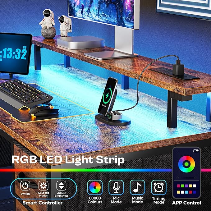 Huuger 47 inch Computer Desk with 4 Drawers, Gaming Desk with LED Lights & Power Outlets, Home Office Desk with Large Storage Space for Bedroom, Work from Home, Rustic Brown