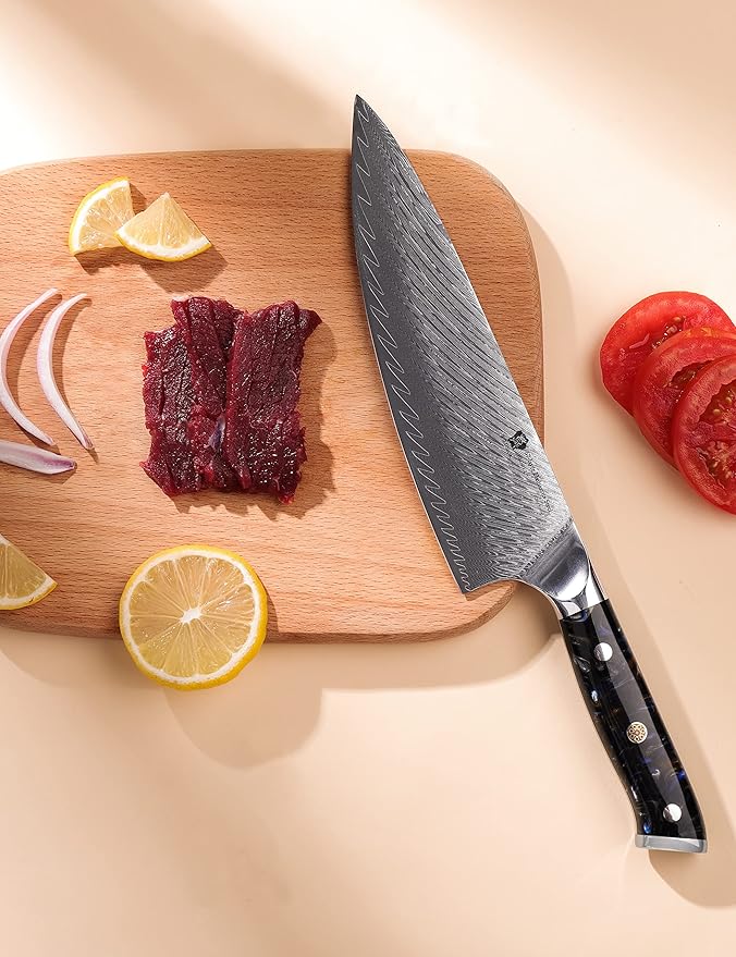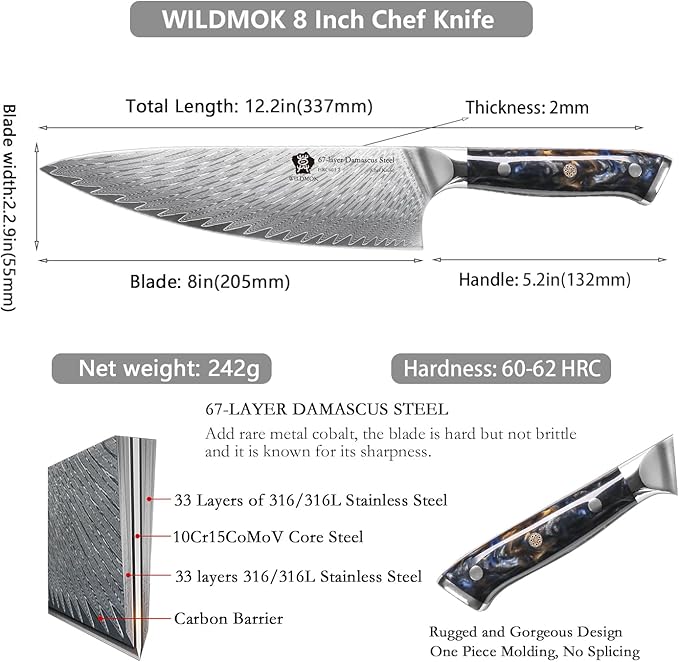 - 【Professional Damascus Chef Knife】WILDMOK chef knife use high quality Japanese 67 layers damascus steel, professional 8 inch chef knives and best gifts for chefs kitchen knives. The Rockwell hardness of the cutting core is 60+. The cutting edge is 10-12 degrees, making it useful for good edge strength while maintaining excellent sharpness.