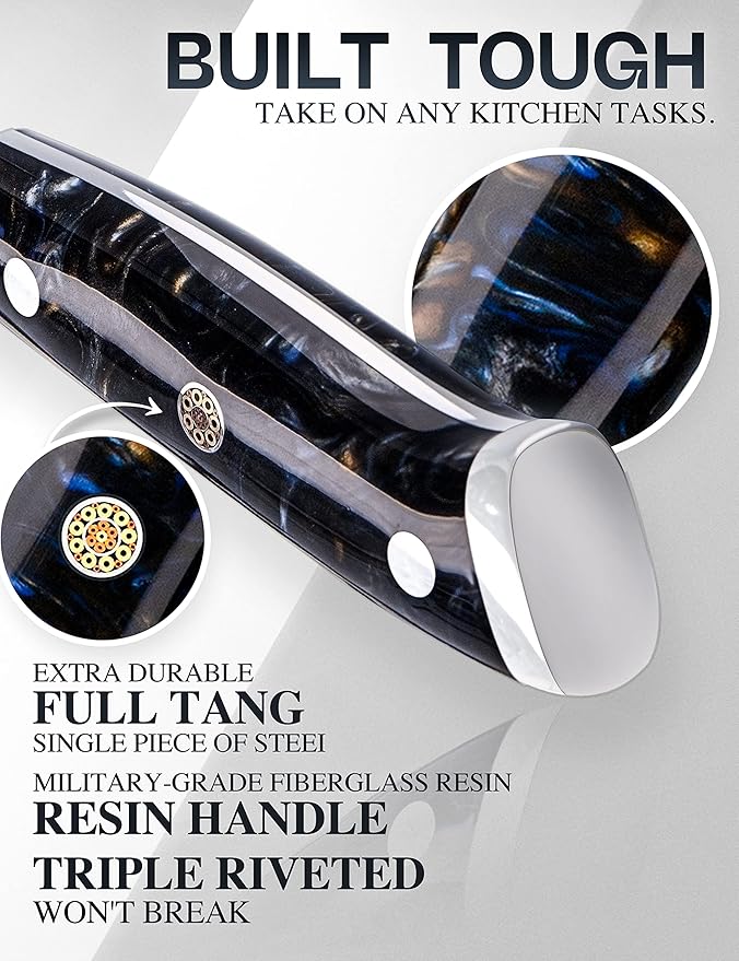 - 【Full Tang Resin Handle】Made of all resin handle which stronger and more stable than G10 handle! This is what Differentiates WILDMOK Knives from the Competition. Resin Handle Triple Riveted to the Forged Full Tang for Extra Strength, Tastefully Adorned with the Classic 3-Metal Mosaic Rivet - feels sturdy and turns heads with its rugged and gorgeous design.