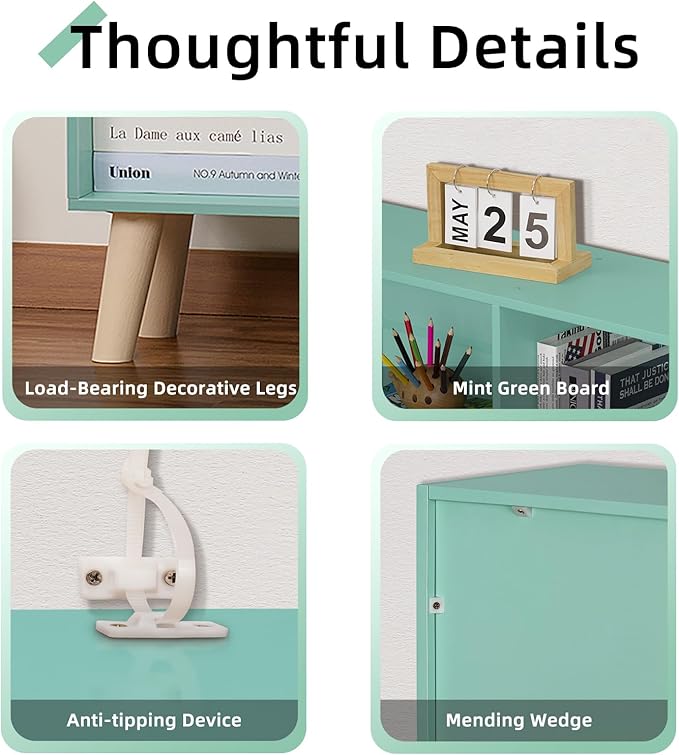 - 【More Applications】The simple upright and open design of the wide book case is perfect for saving space in your house, which can provide versatile storage and display options. This vintage childrens bookshelf can also be used as a storage shelf and display shelf.You can use your imagination to develop even more uses for your mint green bookshelf, displaying beloved items as works of art.